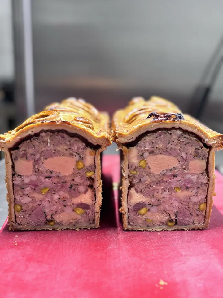 - Pâté en croûte ris de veau, foie gras, girolles et pistaches maison, pickles de légumes et gel framboise